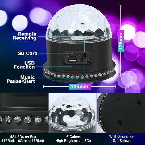 48LEDs RVB : Le support de lampe est entouré de 48 petites perles de lampe colorées et 6 grandes boules de lampe colorées sont placées au centre de l’abat-jour. ( Cette ampoule disco a un abat-jour en verre comme le cristal et le trou réservé sous la base de la lampe offre également la possibilité de l’accrocher au mur. )