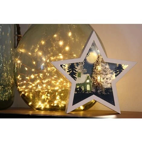 – Décoration de Noël dans cadre à poser Blanc en forme d’étoile, scène de noël lumineuse avec LED représentant des cerfs sous la neige dans la foret – Cette décoration naturelle se place facilement sur une table ou bien un meuble ou encore accrochée au mur.- Cette scène hivernale vous plongera immédiatement dans l’univers magique de Noël.-Matière: Plastique, Piles non fournies. LR6 1,5V
