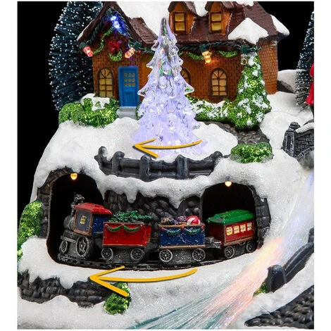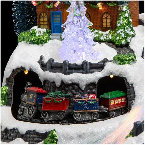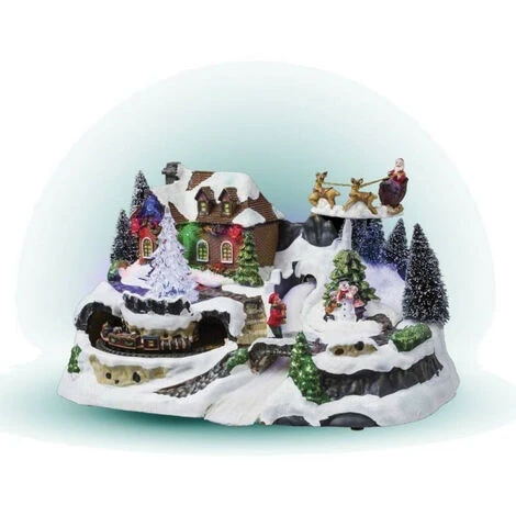 Ce joli village est lumineux, et le traineau et le train sont en mouvements.