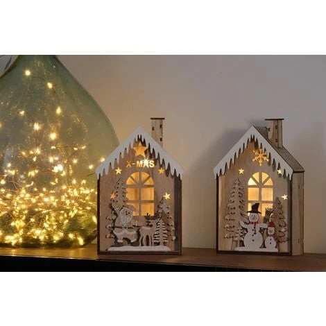 – 2 maisons de Noël en Bois avec leurs personnages Père Noël et Bonhomme de neige ainsi qu’un joli éclairage LED.- Très beau rendu, cette scène de Noël vous plongera immédiatement dans l’atmosphère magique de Noël.- Dimensions : h=23cm l=14,5cm– Piles non incluses LR6 1,5 V